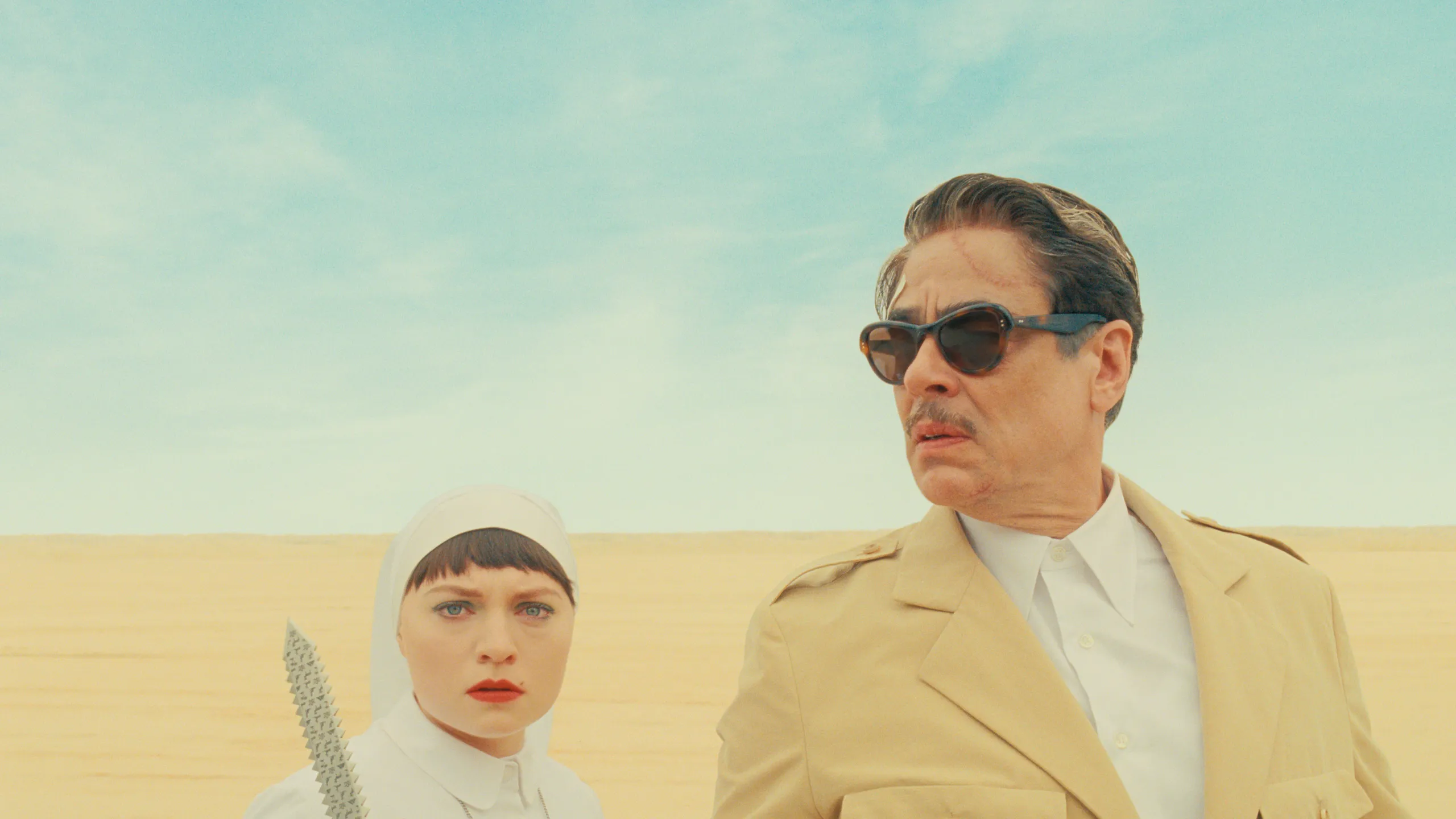 El esquemático viaje de redención, de la villanía a la heroicidad, del protagonista va acompañado de un progresivo acercamiento al rostro cada vez más vulnerable de Benicio del Toro, pues al inicio de la cinta, los primeros planos daban cuenta solamente de una expresividad amenazante, enfatizada por la rítmica partitura de Alexandre Desplat, pero al final nos conectan con su emoción genuina, como se lograba también con el mismo recurso en los momentos climáticos de The Life Aquatic with Steve Zissou (2004) o Moonrise Kingdom (2012), en los que la artificialidad se dejaba de lado momentáneamente, para que la interpretación brillara y la sentimentalidad subyacente se colara a la perfección. A su vez, la evolución del personaje se va articulando y expresando en una serie de diálogos sobre la devoción, la creencia y la fe, que completan esas repentinas y poco aprovechadas fugas surreales en blanco y negro al Cielo, que recuerdan a la A vida o muerte de Michael Powell y Emeric Pressburger. Por último, tal arco de redención y transformación es paralelo al buñueliano proceso de liberación de Liesl, descubriendo los placeres terrenales y las alegrías que su religión le prohibía, especialmente en ese pasaje en la selva en que las confesiones se cruzan y las máscaras se caen, al más puro estilo de La muerte en este jardín del propio Buñuel.