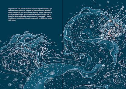 Resaltamos cómo el trabajo de ilustración dialoga de forma tan asertiva y coherente con la novela. No sólo en remarcar los espacios temporales del pasado y el presente, sino por la vibrante fuerza del mundo submarino o la noche. Existe un condicionamiento en la lectura con el uso de la tipografía en ciertos fondos. Este acompañamiento emocional conmueve.